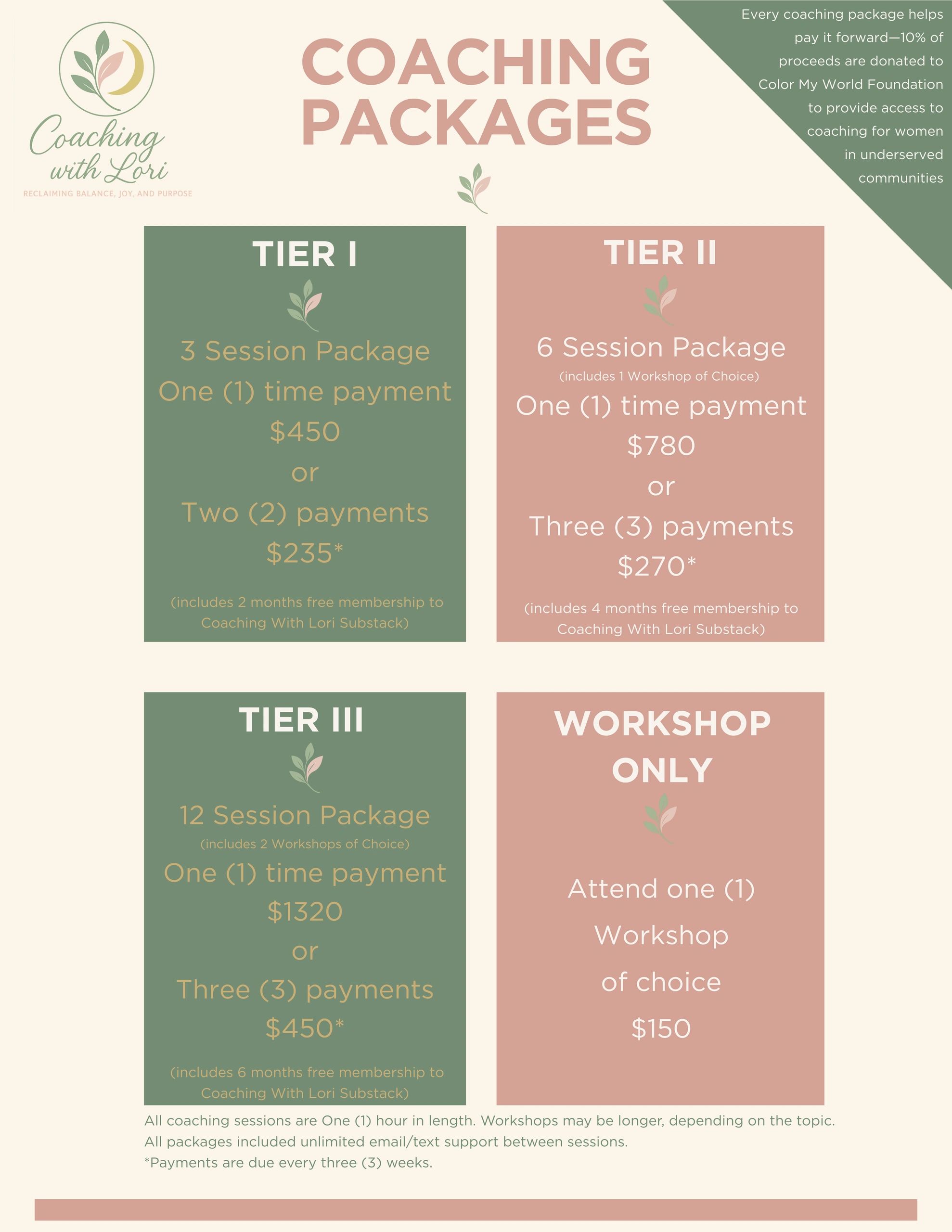 To help you experience the power of coaching, Lori offers a complimentary one hour sample session. In this one-on-one conversation, you can share what is on your heart, gain clarity around goals, and explore how coaching can support your journey. It is a safe, no-pressure space to see if this path is right for you.